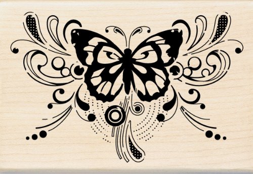Create butterfly magic with this wood stamp. Flourishes surrounding a fluttering butterfly create the perfect design for embossing, flocking or glitter techniques on cards, scrapbooks and more. 2-1/4-inch by 2-1/2-inch.
