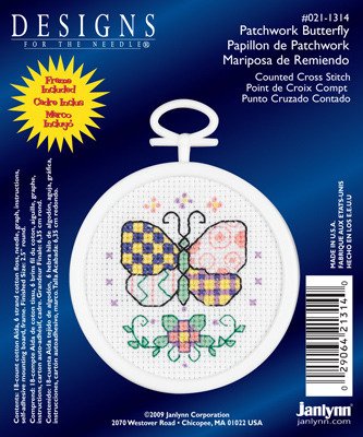These kits are quick, easy and will appeal to kids of all ages. Perfect as gift tags, stocking stuffers and more. Use the included frame as a hoop. Kit contains 18-count Aida, 6-strand cotton floss, needle, mounting board, graph and instructions. Finished size: 2-1/2" round. Design: Patchwork Butterfly.