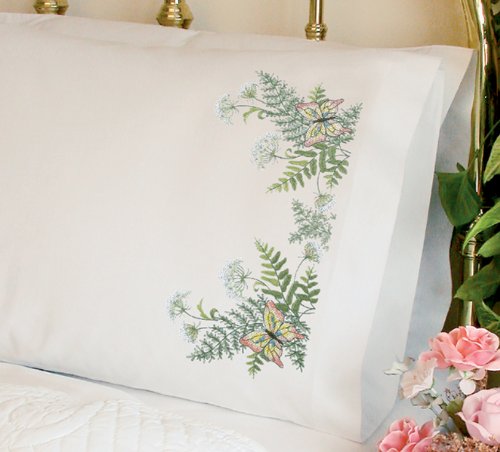 Stamped Cross Stitch: Pillowcases. Stitch a perfect pair of pillow cases for a friend or just your guest room. This kit contains pre-printed design on 2 standard poly/cotton white pillowcases (20" x 30"), a detailed shopping list and easy-to-follow instructions. Design: Butterflies And Fern. Made in USA.