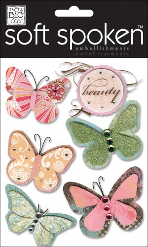Soft Spoken Embellishments: Fashion District Butterflies. These dimensional, layered, multi media embellishments will add wonderful texture and dimension to any otherwise flat surface. Hand made of chipboard, cardstock, glitter, gens, wire and more, these beautiful self-adhesive embellishments are perfect for greeting cards, scrapbook layouts and much more! This package contains one 5-3/4" x 4-1/4" sheet of 6 stickers: five butterflies and one tag: BEAUTY.