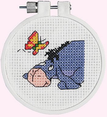 JANLYNN-Disney Mini Counted Cross Stitch. These kits are quick; easy and will appeal to kids of all ages. Perfect as gift tags; stocking stuffers and more. Use the included frame as a hoop. Kit contains 18 count Aida; 6-strand cotton floss; needle; mounting board; graph and instructions. Finished size: 3in round. Design: Eeyore & Butterfly (Winnie the Pooh). Made in USA.