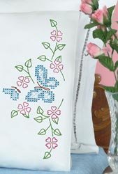 Stamped Embroidery: Pillowcases: 2pc. Each package contains 2 standard 20" x 30" Perle edge pillowcases of cotton/poly broadcloth, instructions for completion and care and complete floss requirements.