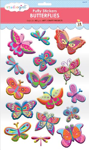 GRANT STUDIOS-Studio Girl Puffy Stickers: Butterflies. Spice up any project with these glitter and pearlised puffy stickers. Use them to embellish cards; invitations; stationery; scrapbooks and all other creative projects. This package includes one 11x7-1/2 inch sheet of puffy glitter stickers: 16 total pieces. Imported.
