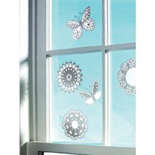 Decorate mirrors, windows, and glass with these delicate Doily Lace window clings from Martha Stewart Crafts™. Butterflies and lacy designs stick without adhesive and peel off for use year after year. Includes 12 pieces.